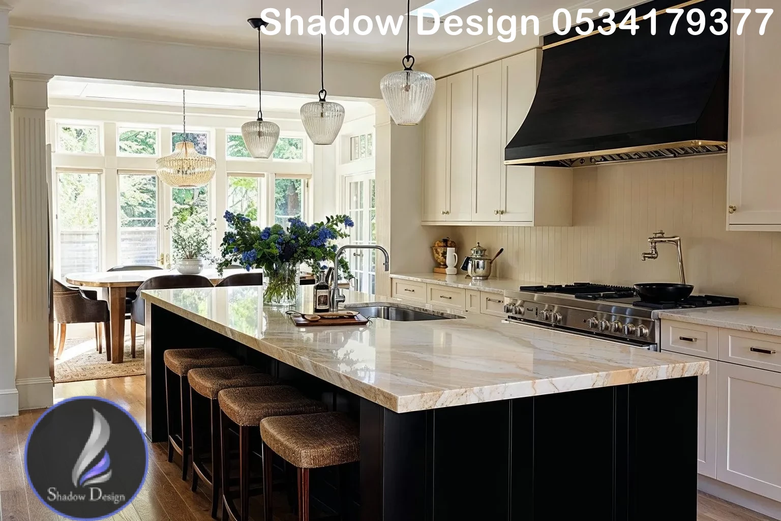 لإضفاء لمسة إضافية من الرقي والفخامة على مطبخك، أضف تفاصيل معدنية مثل مقابض الأبواب باللون الذهبي أو الفضي، أو حتى إضاءة معلقة مصنوعة من النحاس. تساعد هذه اللمسات في كسر اللون الأسود وجعل المطبخ يبدو أوسع وأكثر فخامة. شادو ديزاين توفر لك تشكيلة متنوعة من الخيارات المعدنية لتختار ما يناسبك ويناسب ذوقك.
