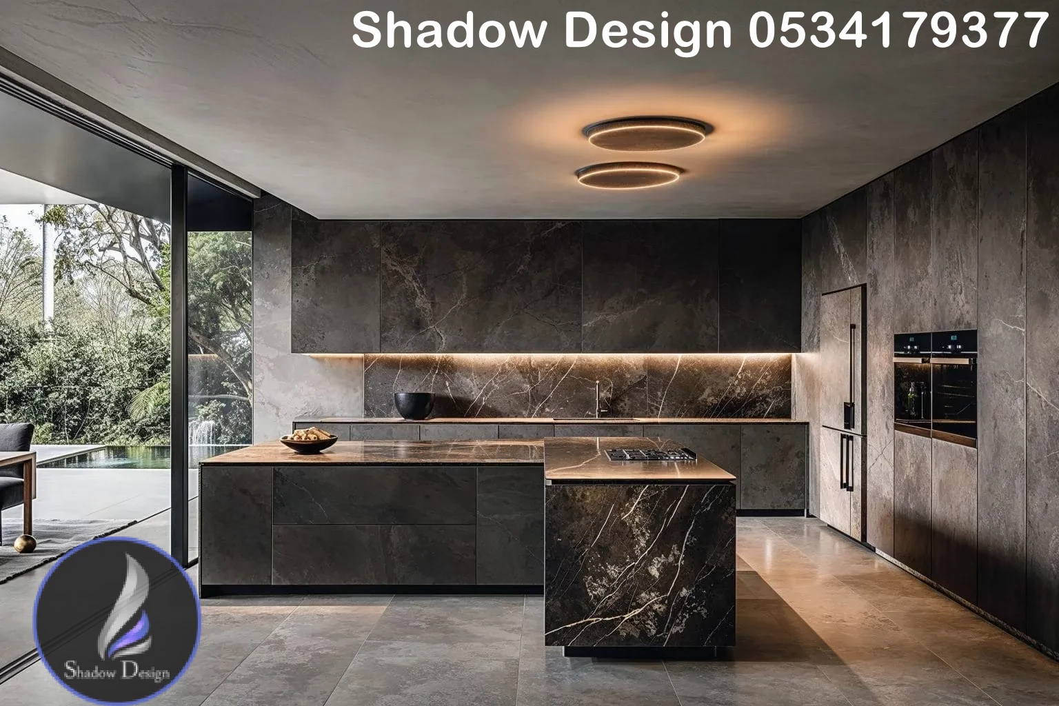 إذا كنت تبحث عن تصميم يجمع بين الفخامة واللمسات العصرية، فالخيار الأمثل هو استخدام الرخام الأسود بتفاصيله الطبيعية الفاخرة. الرخام الأسود يضيف عمقًا وسحرًا خاصًا للمطبخ، لا سيما إذا تم استخدامه على الأسطح أو الجدران. يمكنك أيضًا اختيار خزائن باللون الأسود لتتماشى مع الرخام، ما يمنح المطبخ جاذبية لا تُقاوم.
