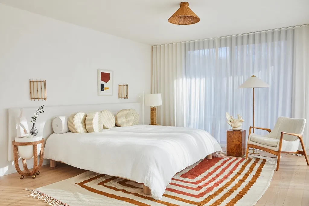 4. لمسات لونية جريئة : إذا كنت تفضل الألوان الزاهية، فإن الأبيض يشكل خلفية مثالية لإبرازها. جرب إضافة سجادة برتقالية أو وسائد بألوان حيوية للحصول على تصميم مفعم بالحياة.